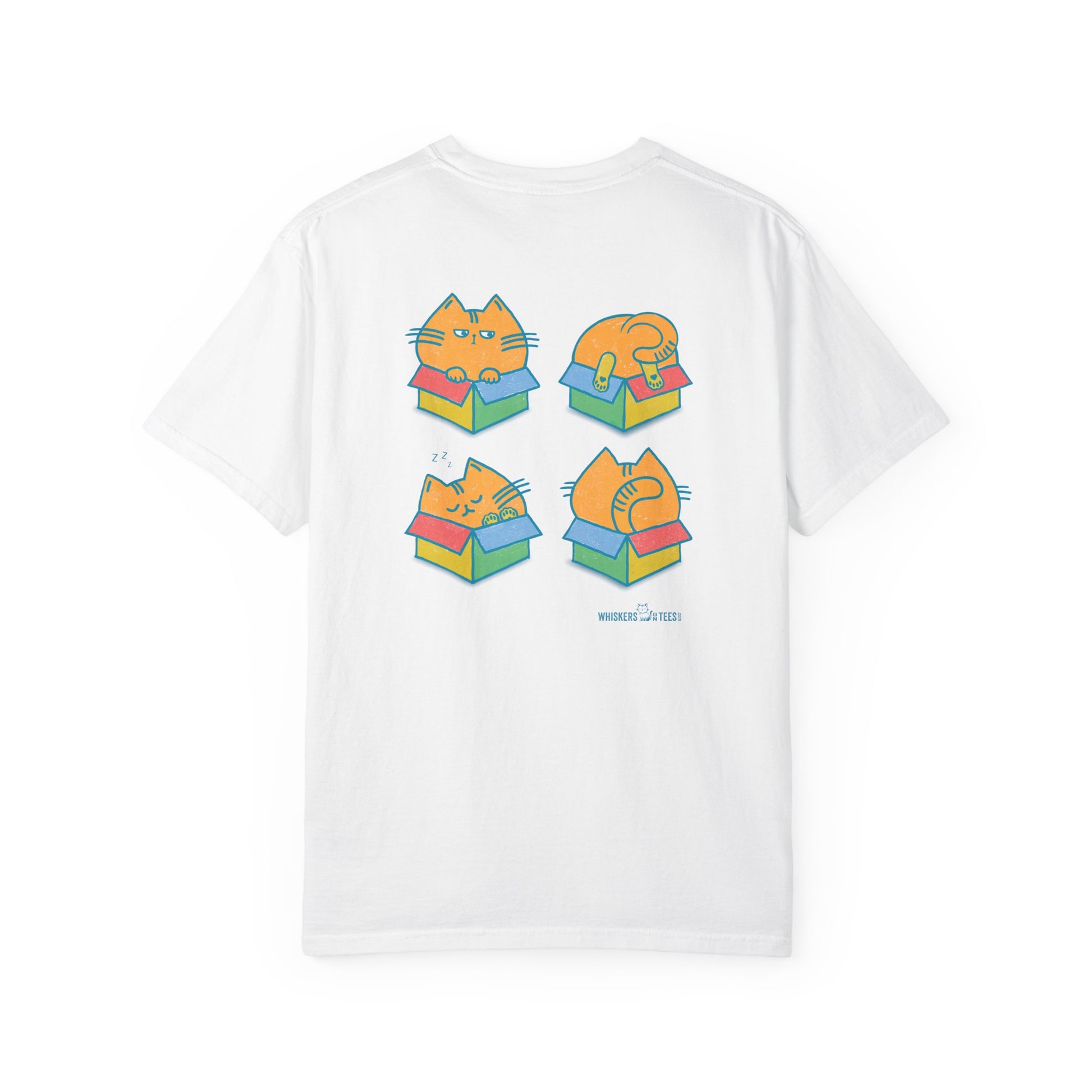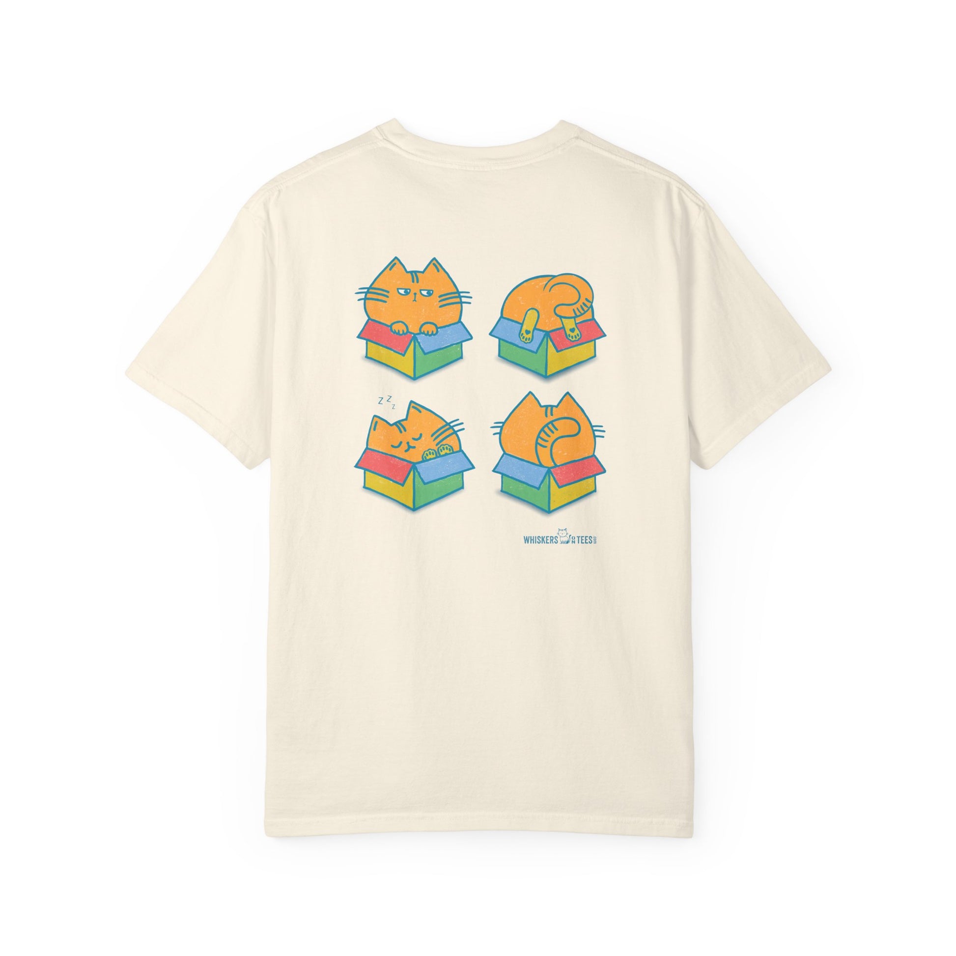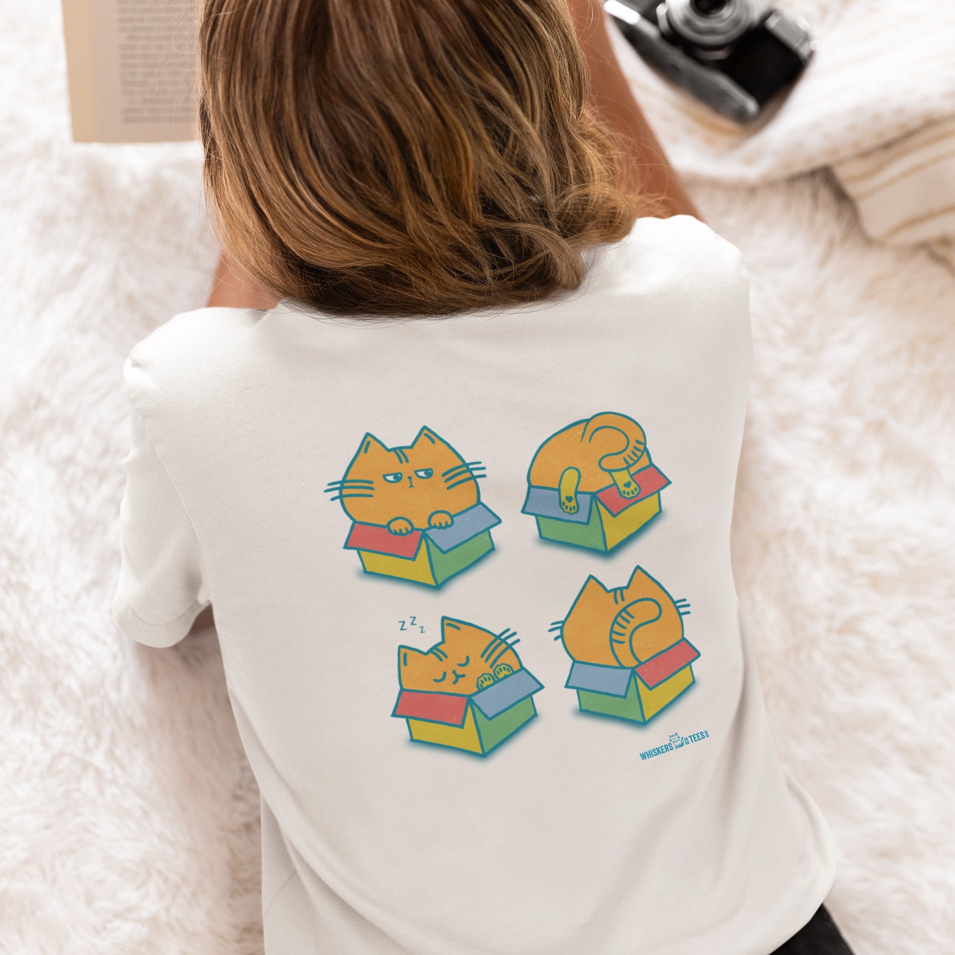 Happiness is simple — box-shaped. This two-sided shirt features a blissed-out orange kitty enjoying the best seat in the house.