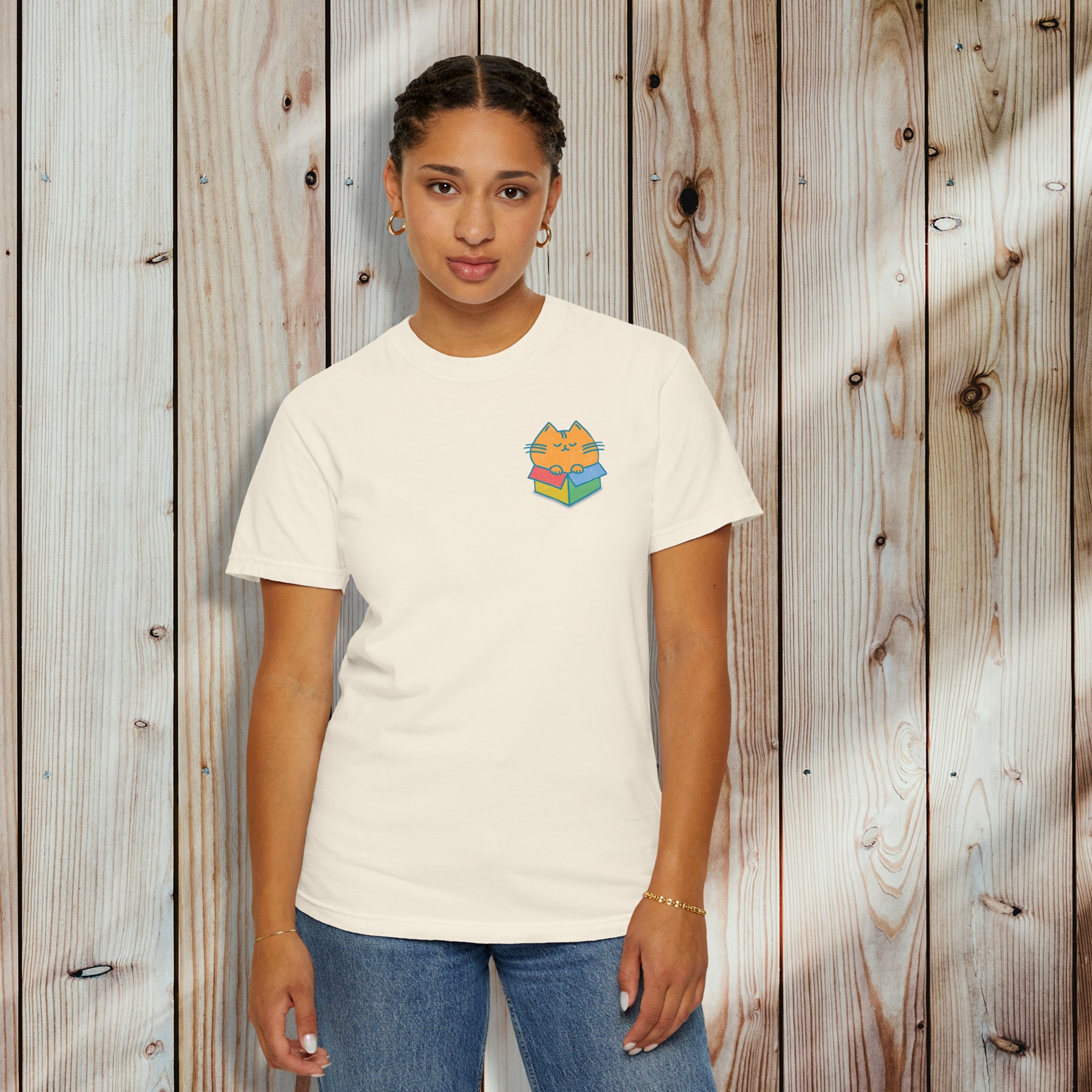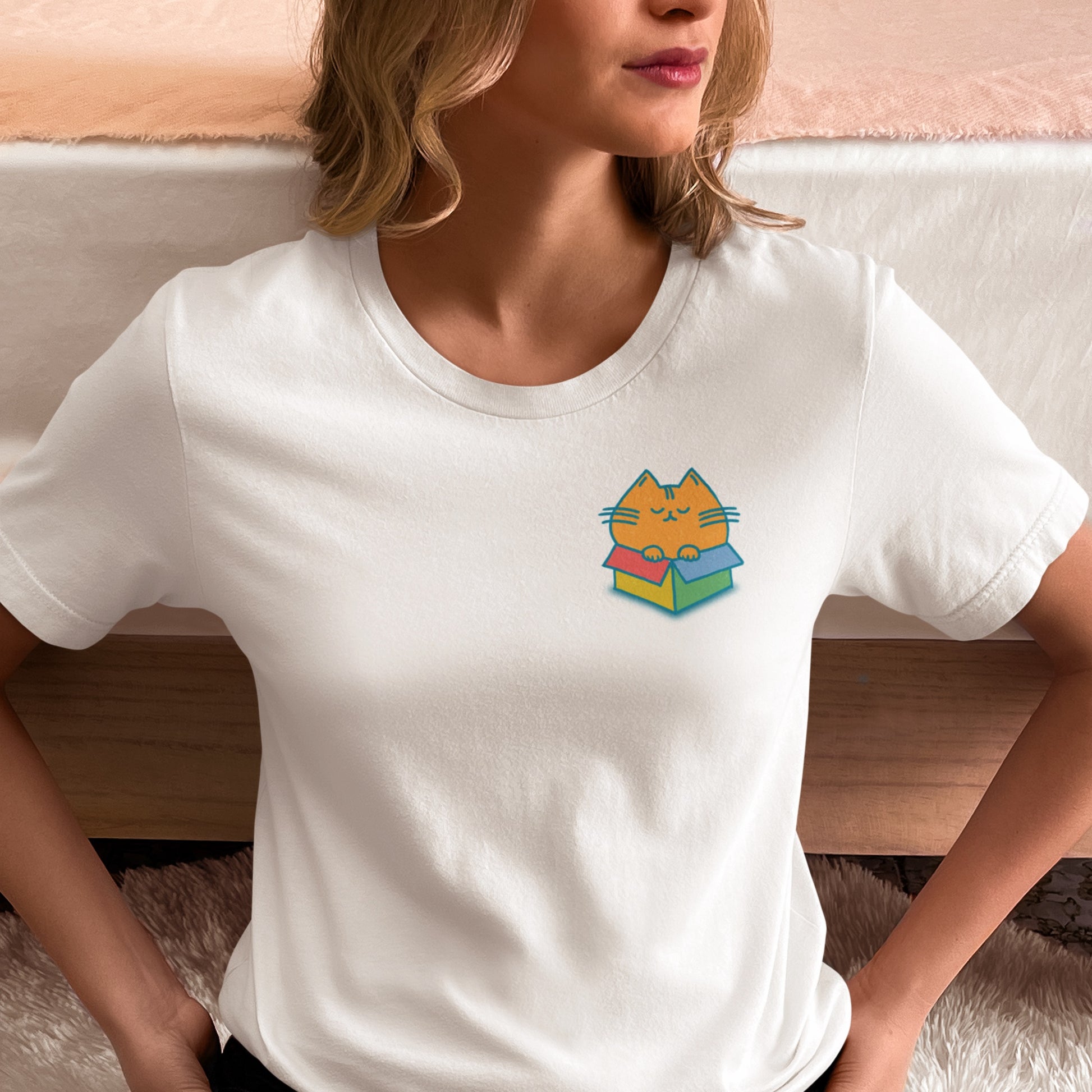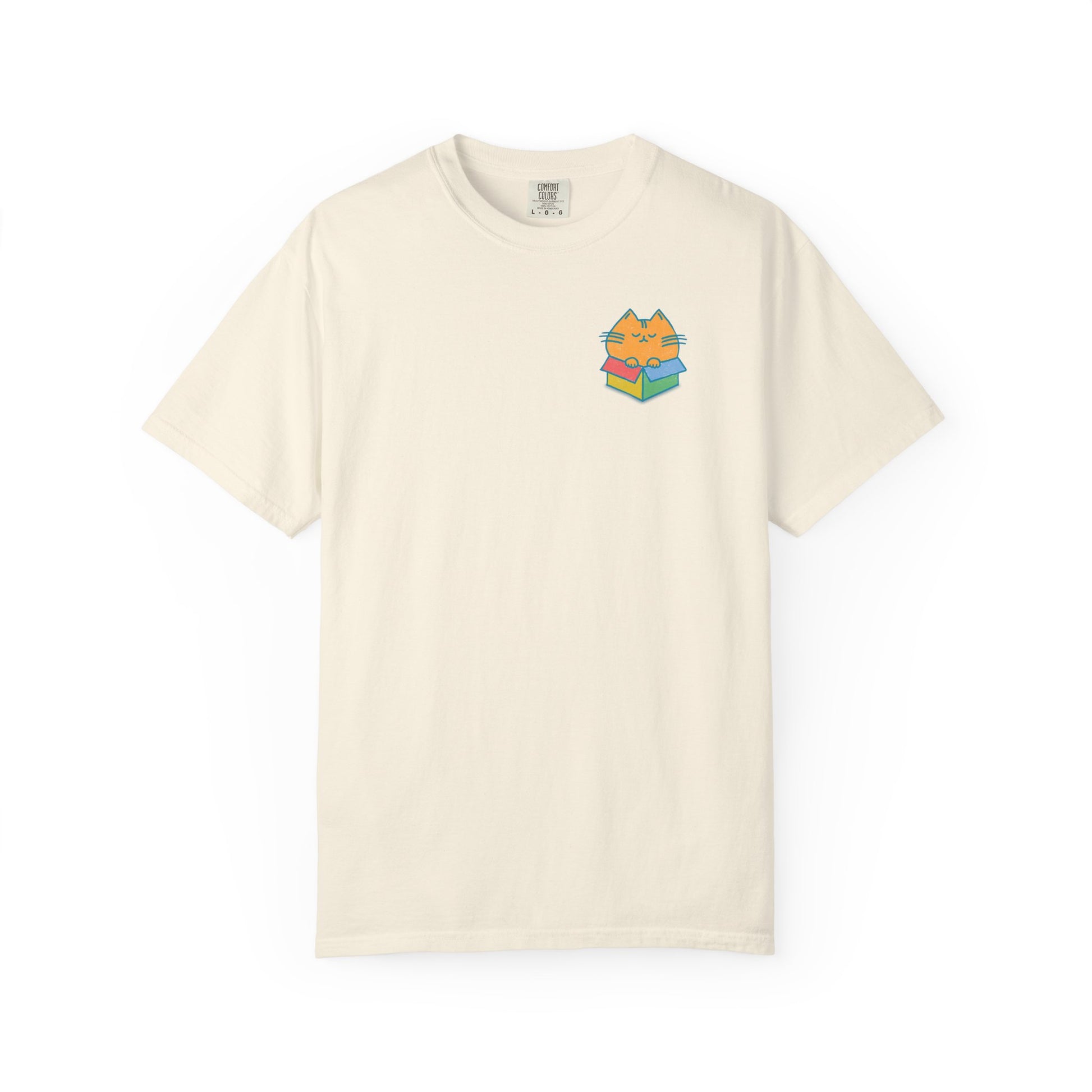 Happiness is simple — box-shaped. This two-sided shirt features a blissed-out orange kitty enjoying the best seat in the house.